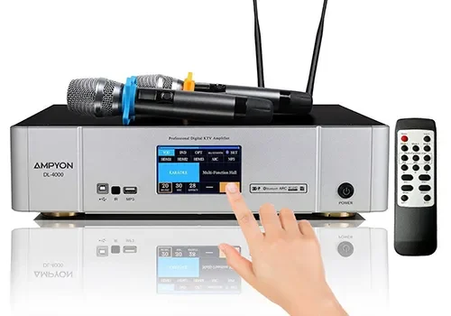The Ampyon DL-4000 is a next-generation digital karaoke amplifier combining power, precision, and convenience. Featuring a 5-inch LCD touchscreen, it offers intuitive control over every sound setting. This three-in-one design integrates a digital processor, amplifier, and UHF wireless microphone system, delivering clear, professional sound in any environment.