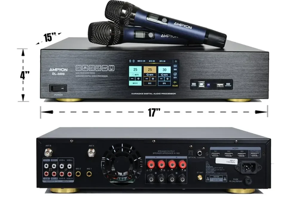 | Trong Hộp Gồm | Amply DL-3000, 2 Micro Không Dây, 1 Remote, 1 Dây Nguồn, 2 Ăng-ten |